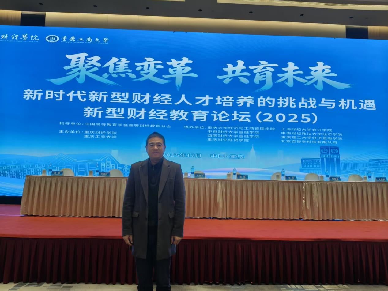 近日,“新型财经教育论坛(2025)”在重庆圆满落幕。本次论坛由中国高等教育学会高等财经教育分会指导,重庆财经学院与重庆工商大学联合主办,以“聚焦变革,共育未来-新时代新型财经人才培养的挑战与机遇”为主题,汇聚国内财经领域近150名校领导、专家学者、行业企业代表等,共话财经教育创新发展。在南京航空航天大学金城学院数字经济产业学院支持下,我院教师蒋辉应邀出席论坛。